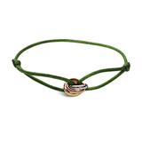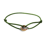 Elevate your style with this minimalist yet sophisticated green cord bracelet, featuring a stunning three-tone infinity knot in silver, gold, and rose gold. Symbolising eternal connection and timeless beauty, this unique blend of metals adds a modern and elegant touch. The adjustable design ensures a comfortable fit for any wrist, making it perfect for everyday wear or as a thoughtful gift. Whether worn alone or stacked with other bracelets, this accessory enhances any outfit with effortless charm.