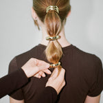 The Double Rippled Curve Hair Tie in Gold exudes rich texture and luminous warmth. Its twin arcs ripple with sculptural detail, bringing an elevated touch to any hairstyle, from relaxed to refined.