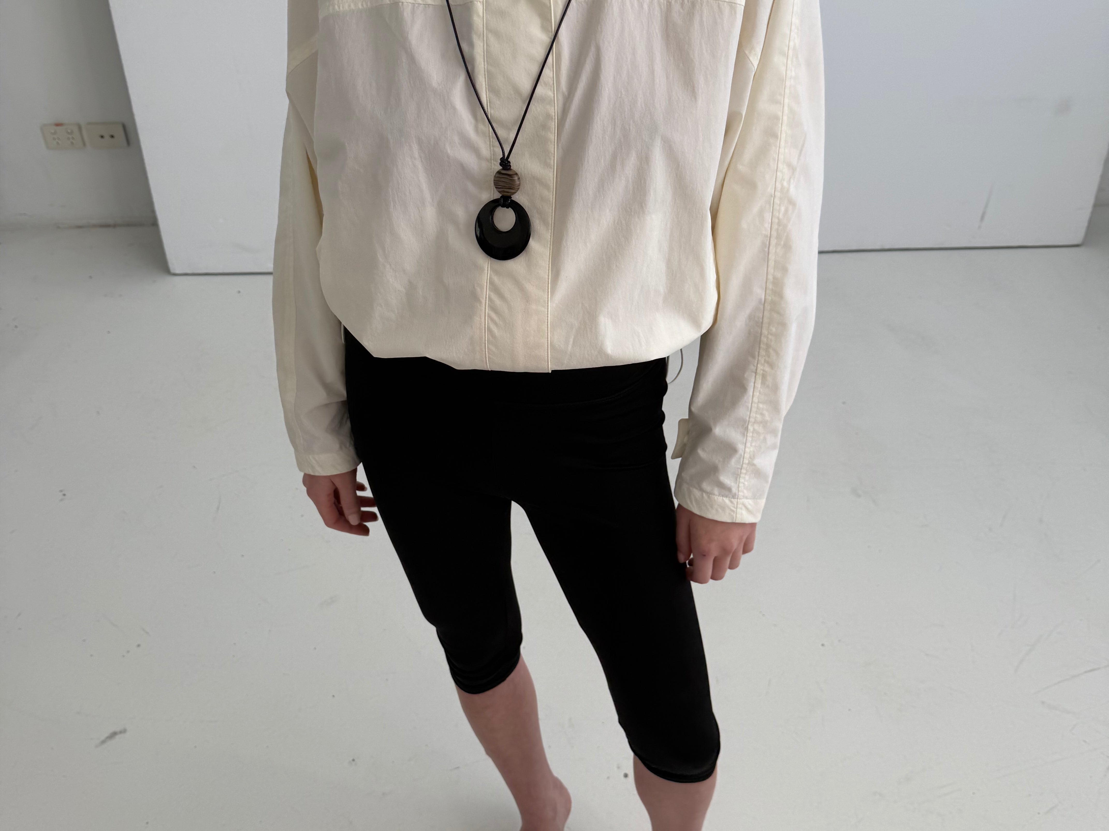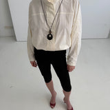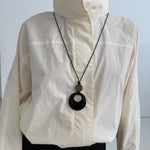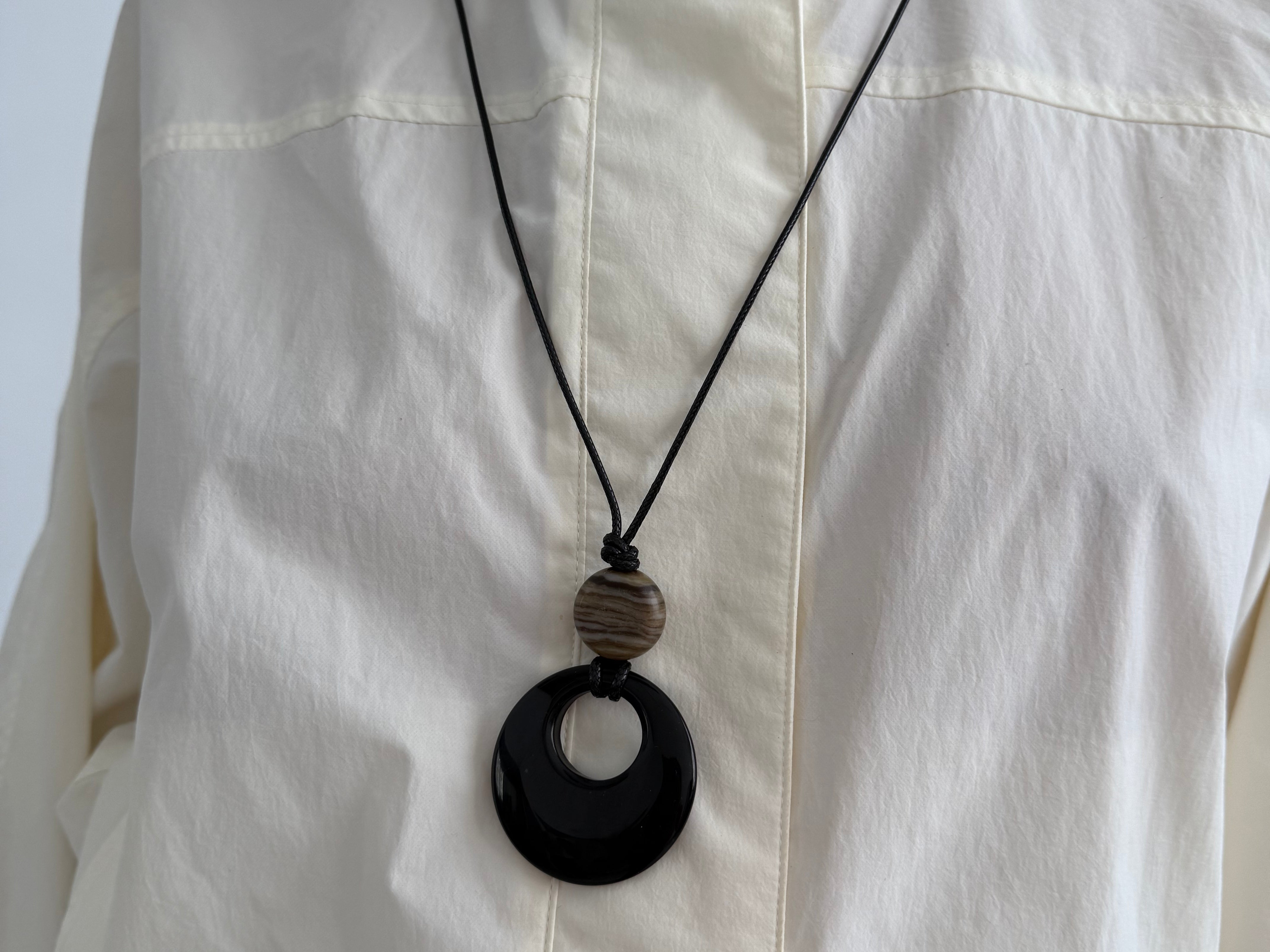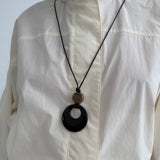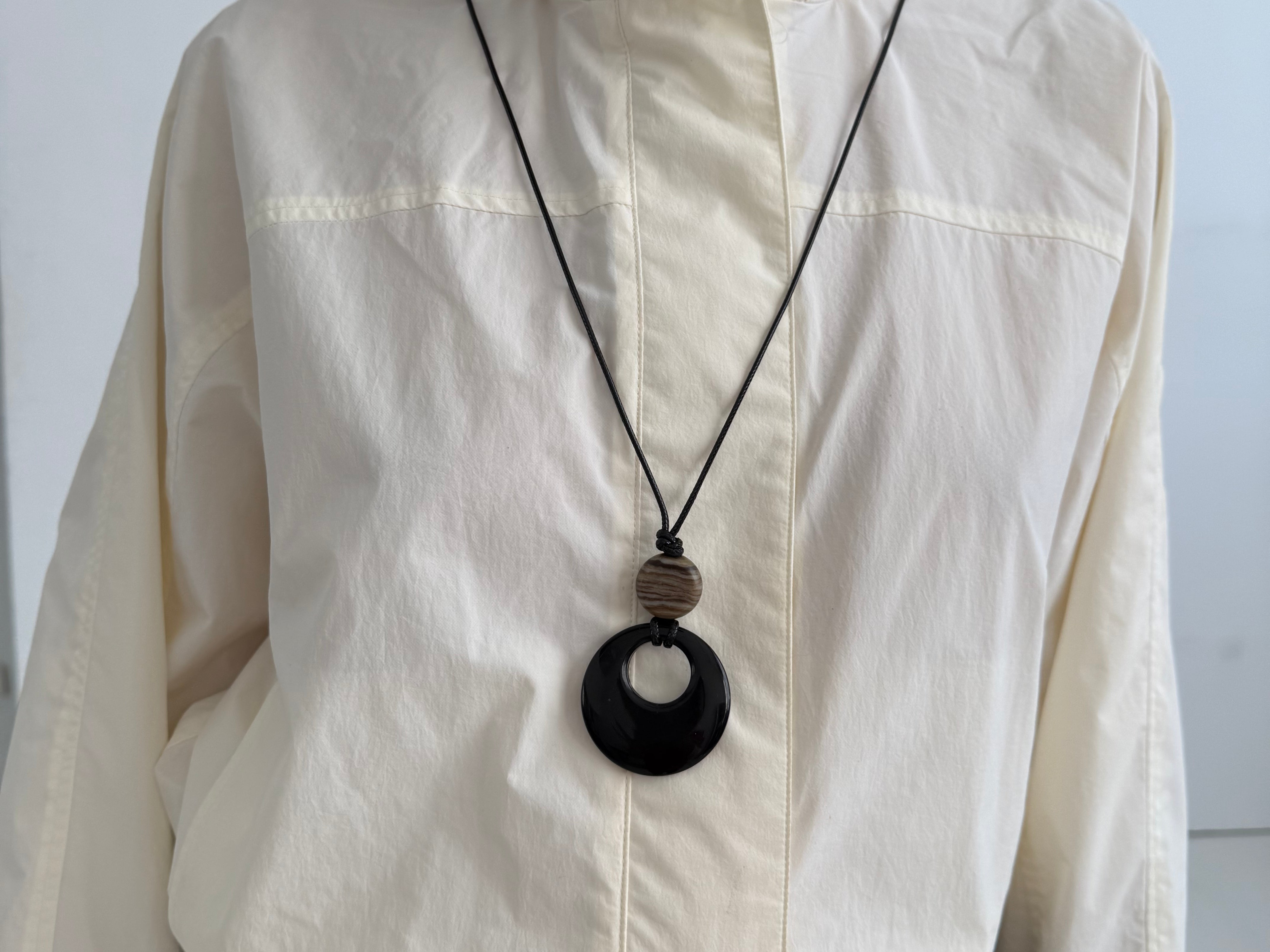 The Ondine Pendant Necklace in Black is a contemporary statement piece that combines natural texture with modern design. Featuring a smooth circular black resin pendant accented with a striped wooden bead, it hangs from an adjustable cord for effortless styling.