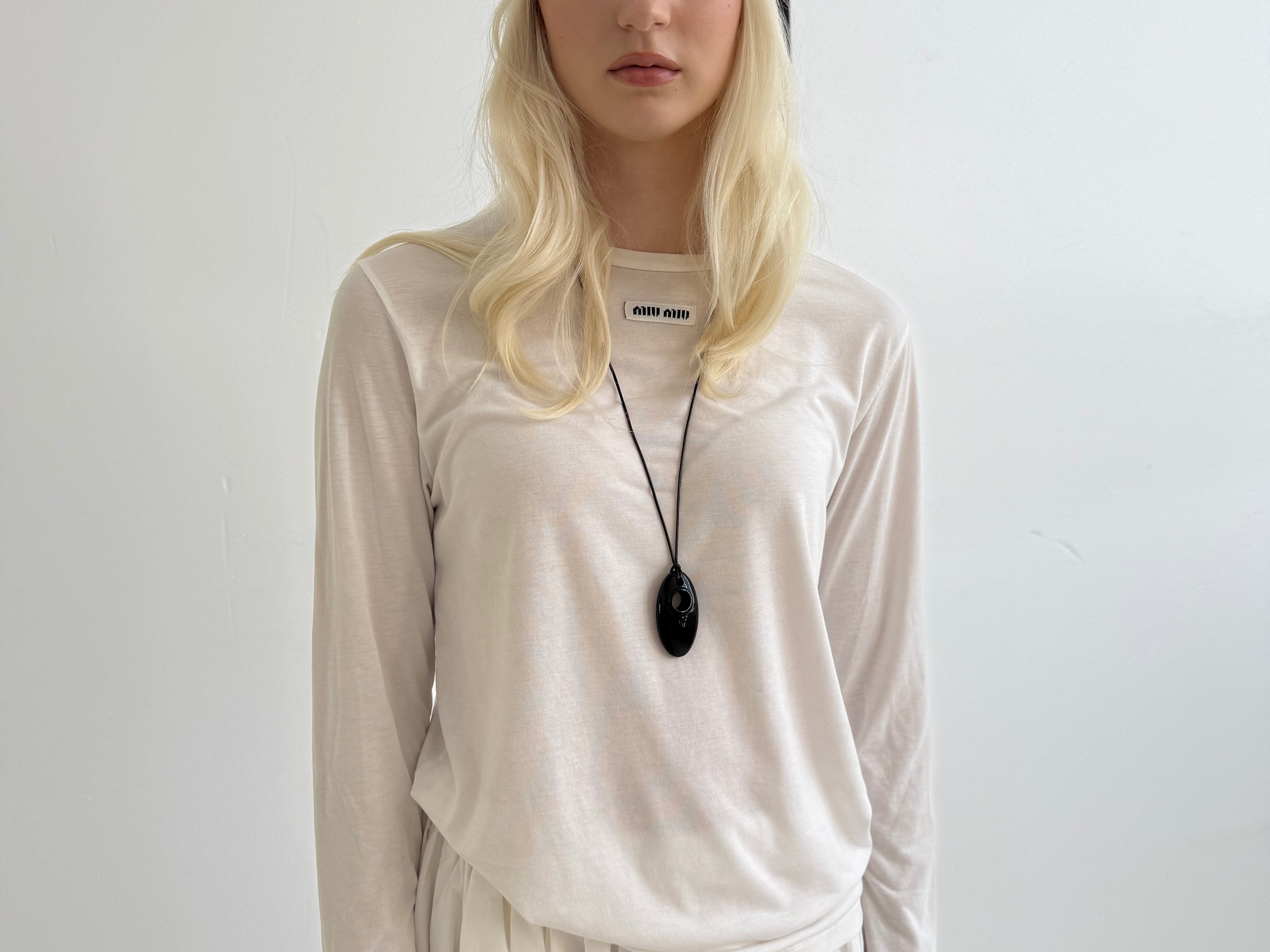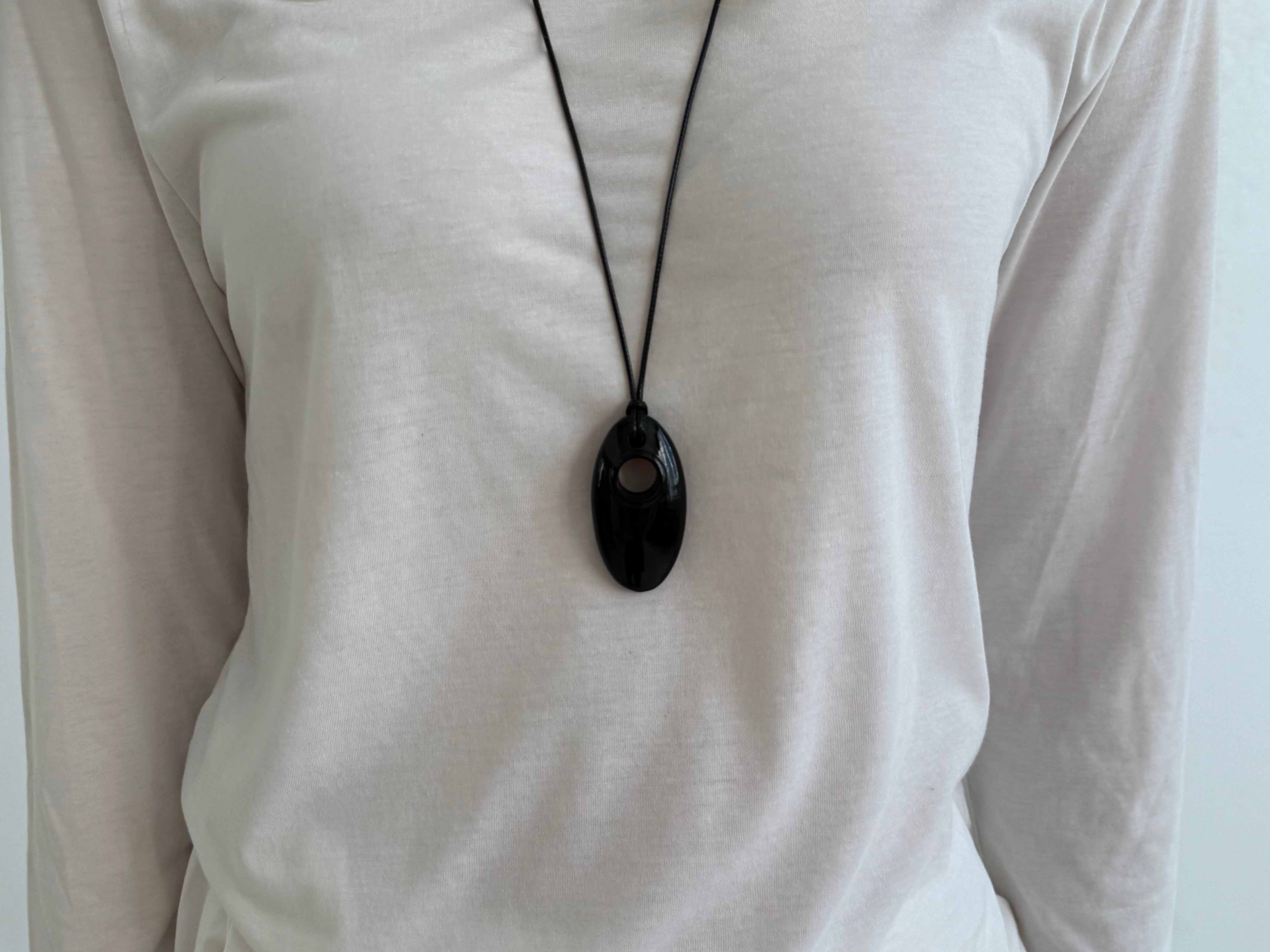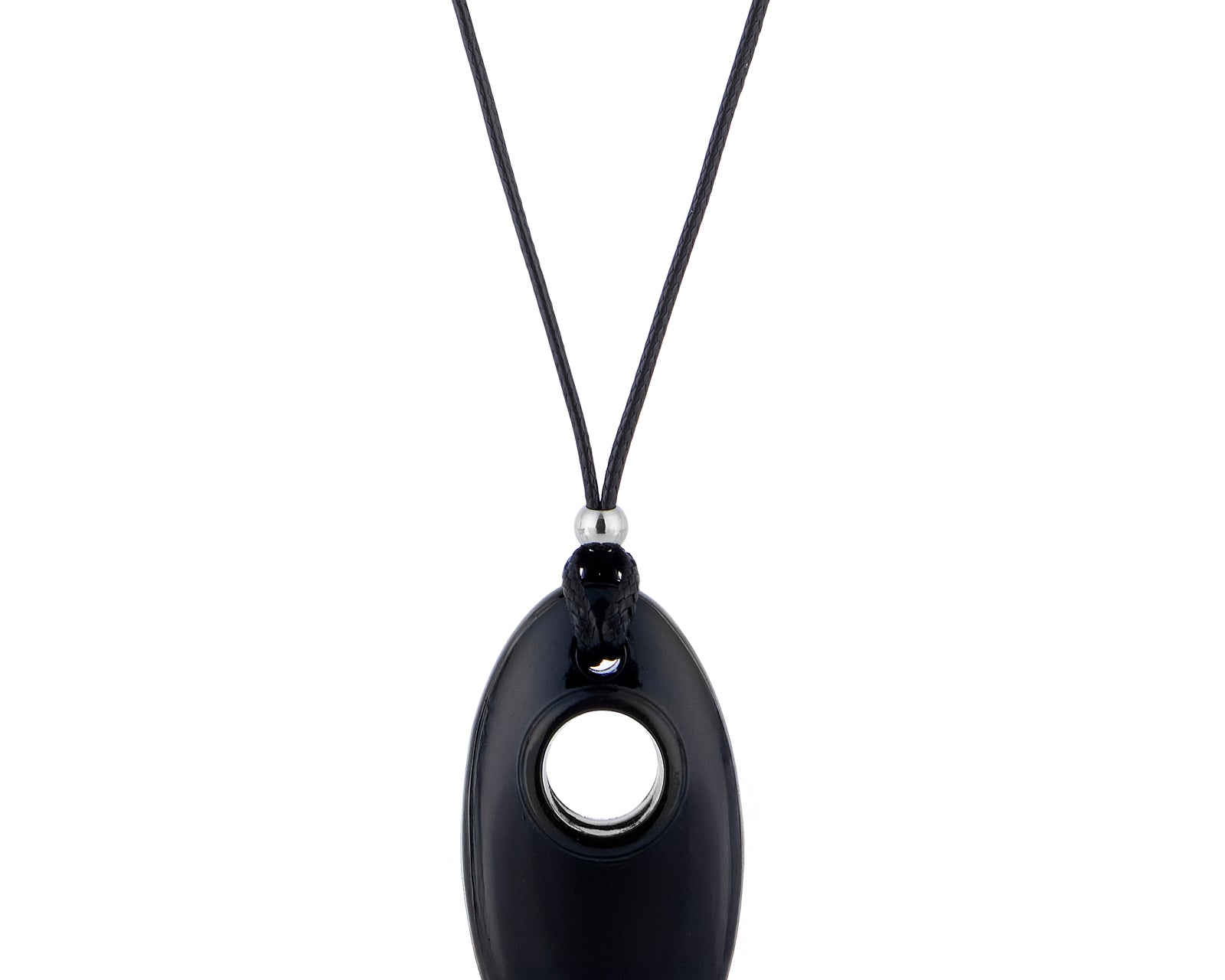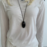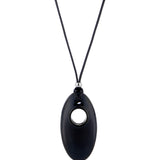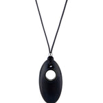 The Orbit Pendant Necklace in Black is a bold, minimalist piece with a glossy resin finish. Designed with an elongated oval pendant on an adjustable cord, it brings a refined edge to everyday wear.